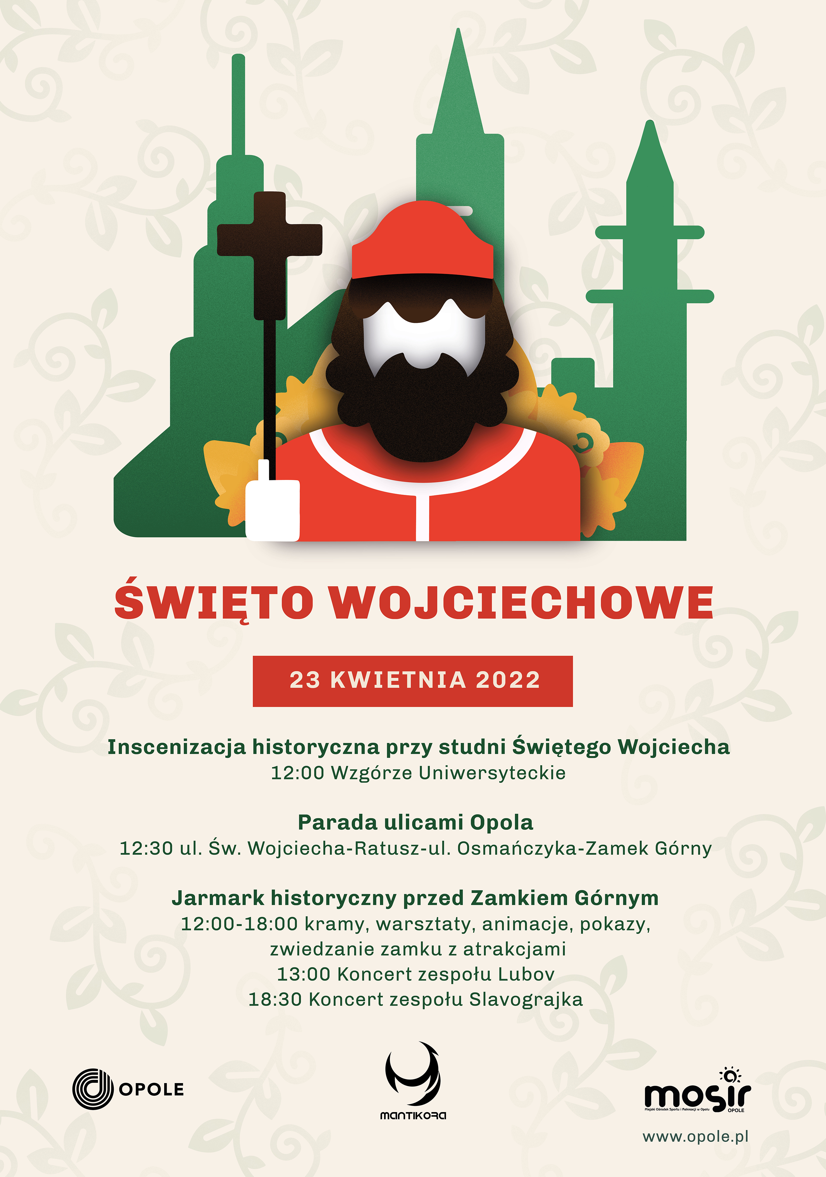 Przed nami Święto Wojciechowe, które już 23 kwietnia otwiera sezon imprez plenerowych w Opolu. To wydarzenie, które uczci patrona naszego miasta – Świętego Wojciecha. W tym roku święto wraz z Miastem Opole zorganizuje Stowarzyszenie Mantikora oraz Miejski Ośrodek Sportu i Rekreacji. W programie znajdzie się wiele atrakcji dla całych rodzin.