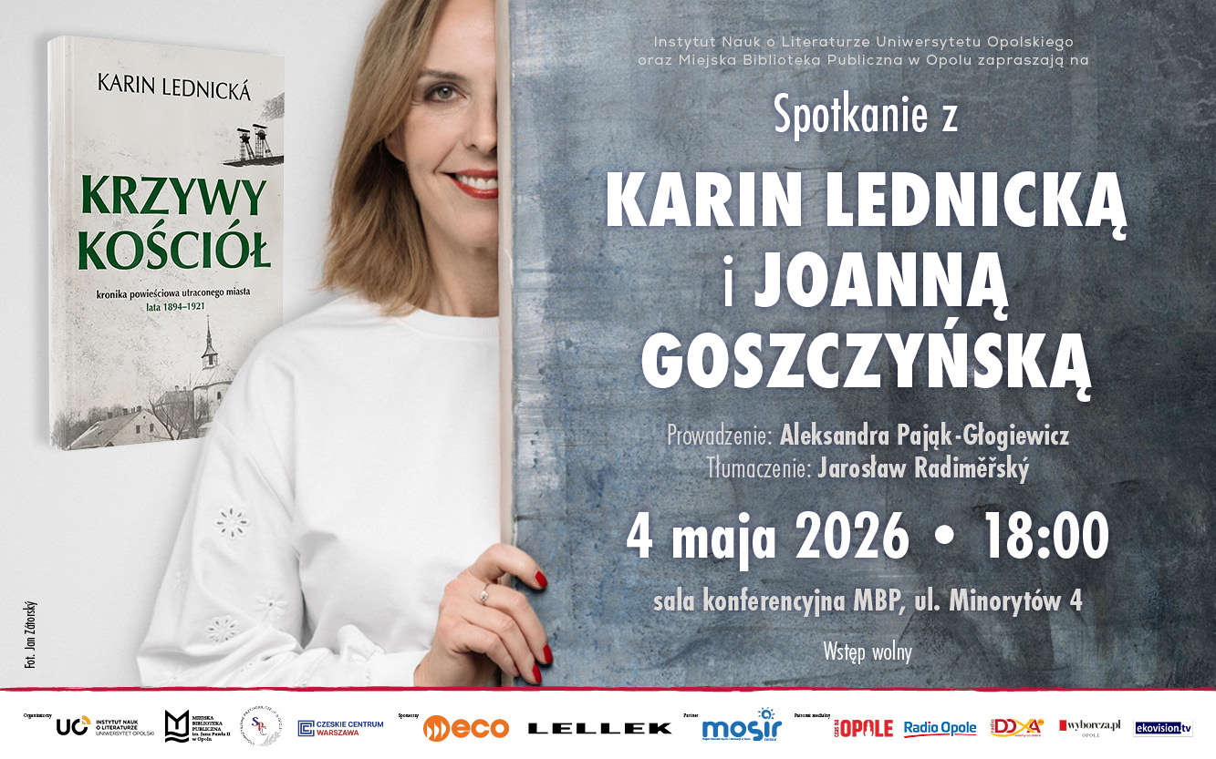 Instytut Nauk o Literaturze Uniwersytetu Opolskiego oraz Miejska Biblioteka Publiczna w Opolu zapraszają na spotkanie z czeską pisarką Karin Lednicką oraz tłumaczką na język polski – profesor Joanną Goszczyńską. Rozmowę na temat książki „Krzywy kościół. Kronika powieściowa utraconego miasta: lata 1894-1921” poprowadzi dr hab. Aleksandra Pająk-Głogiewicz, prof. UO. Spotkanie odbędzie się 4 maja 2026 roku w sali konferencyjnej MBP o godz. 18:00.