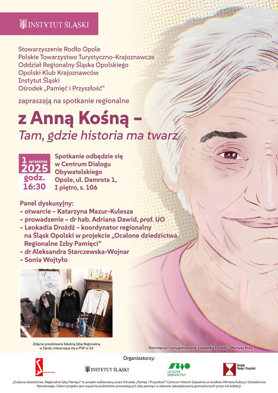 Stowarzyszenie RODŁO Opole, Oddział Regionalny PTTK Śląska Opolskiego Opolski Klub Krajoznawców, Instytut Śląski oraz Ośrodek „Pamięć i Przyszłość” zapraszają na spotkanie z Anną Kośną - Tam, gdzie historia ma twarz, które odbędzie się 1 września (poniedziałek) 2025 r. o godz. 16:30 Centrum Dialogu Obywatelskiego, sala 106.