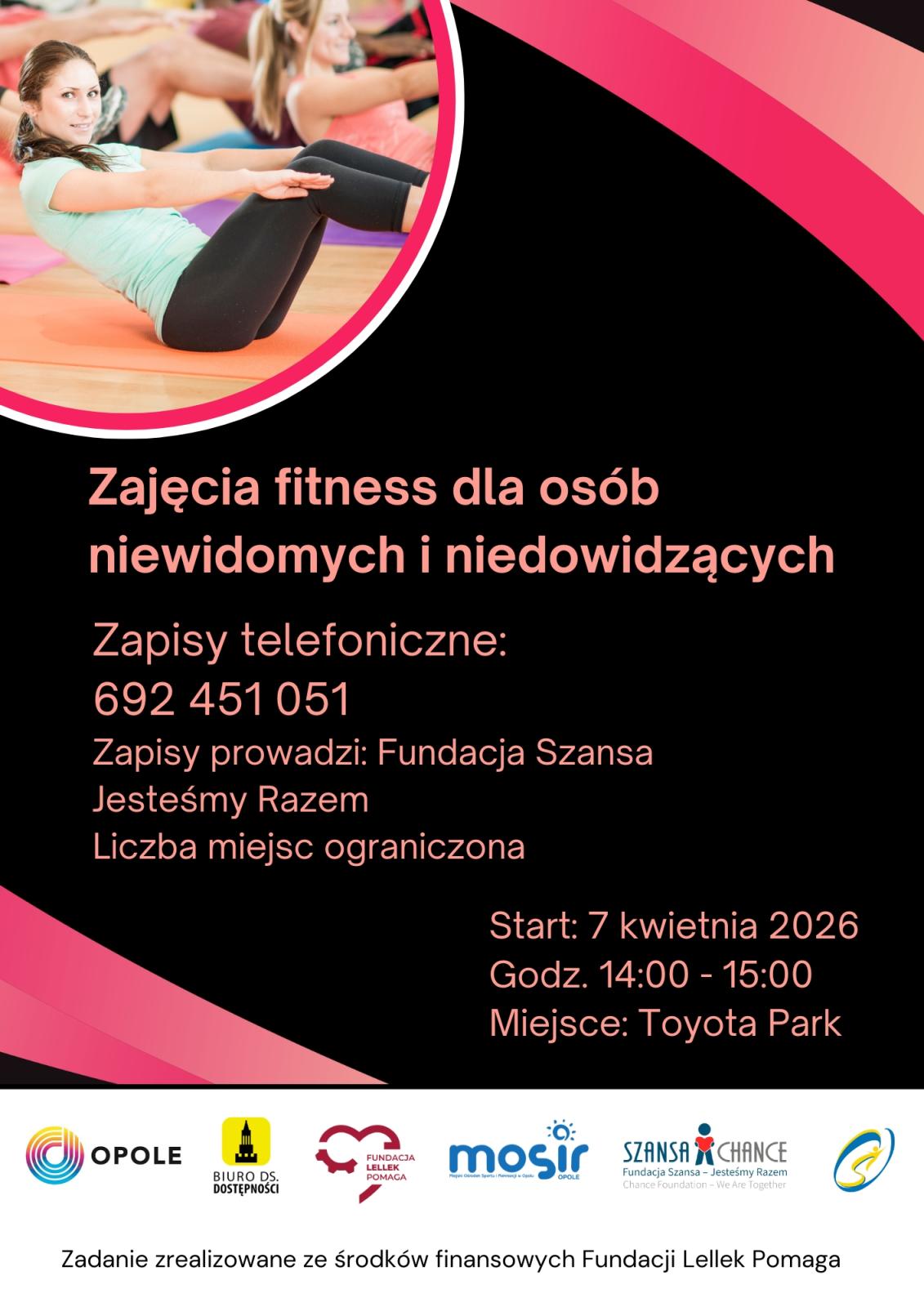 Biuro ds. Dostępności Urzędu Miasta Opola, Fundacja Lellek Pomaga, MOSIR Opole, Fundacja Szansa Jesteśmy Razem oraz Centrum Informacyjno-Edukacyjne Senior w Opolu serdecznie zapraszają na zajęcia fitness dla osób niewidomych i niedowidzących.