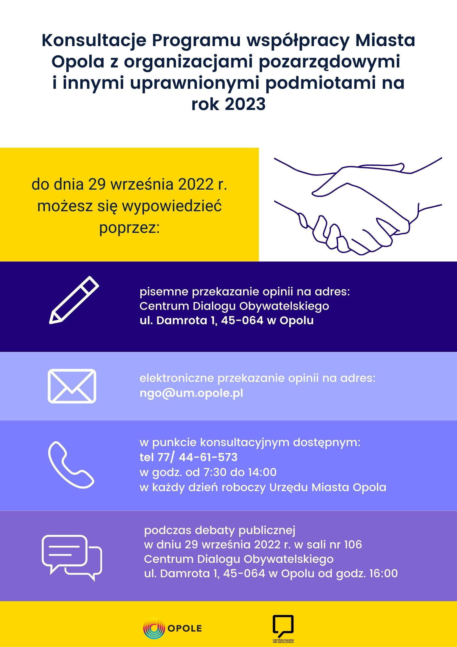4) udział w debacie publicznej w dniu 29 września 2022 r. w sali nr 106 Centrum Dialogu Obywatelskiego ul. Damrota 1, 45-064 w Opolu od godz. 16:00.