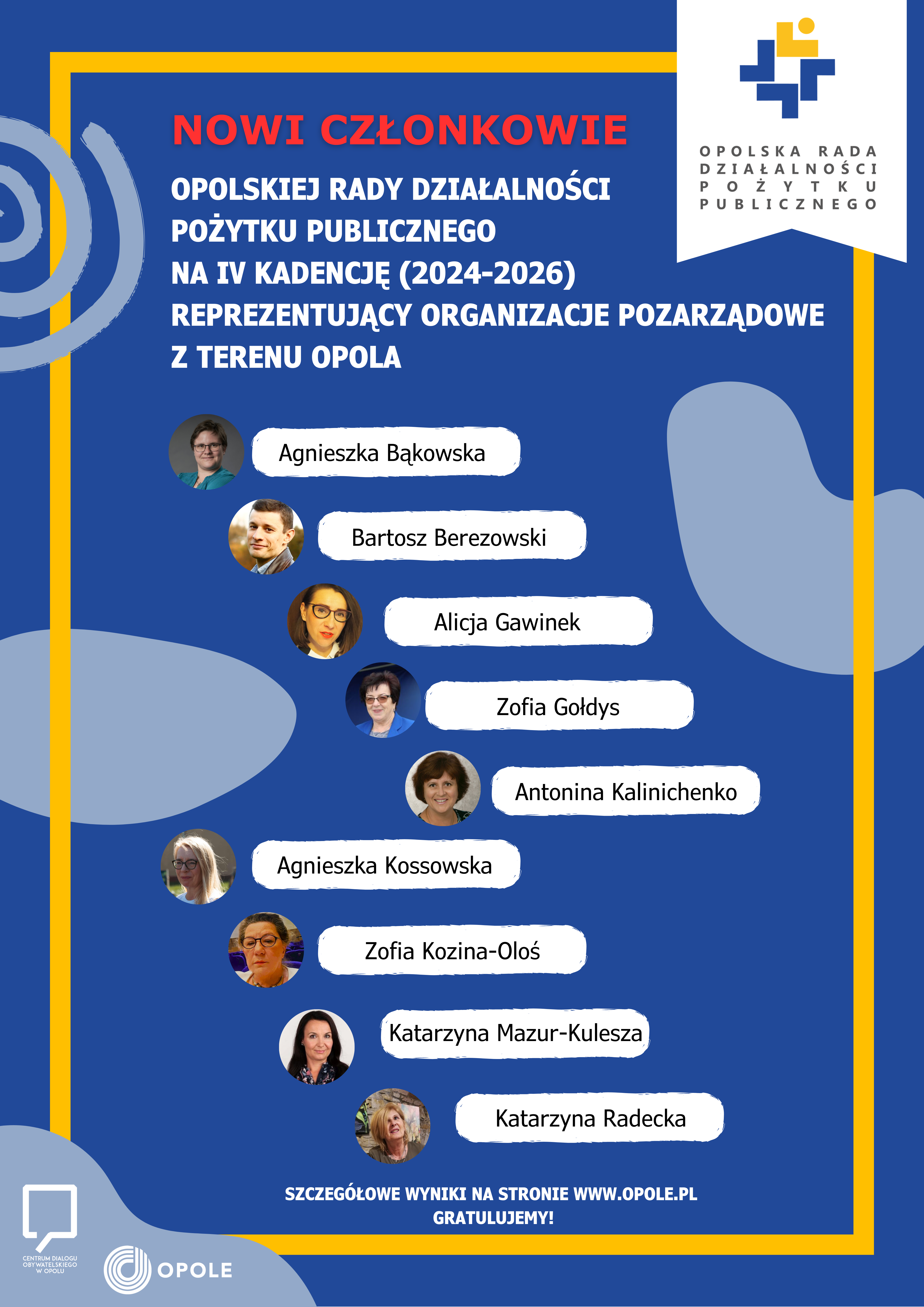 Na podstawie zarządzenia Nr OR-I.0050.801.2023 Prezydenta Miasta Opola z dnia 17 listopada 2023 r. w sprawie powołania Opolskiej Rady Działalności Pożytku Publicznego na IV kadencję, zmienionego zarządzeniem Nr OR-I.0050.77.2026 z dnia 6 lutego 2026 r. zmieniającym zarządzenie w sprawie powołania Opolskiej Rady Działalności Pożytku Publicznego na IV kadencję i w związku z uchwałą Nr XXXIV/662/16 Rady Miasta Opola z dnia 24 listopada 2016 r. w sprawie określenia trybu powalania członków oraz organizacji i trybu działania Opolskiej Rady Działalności Pożytku Publicznego, Prezydent Miasta Opola powołał na przedstawiciela Prezydenta Miasta Opola na IV kadencję: Małgorzatę Kozak
