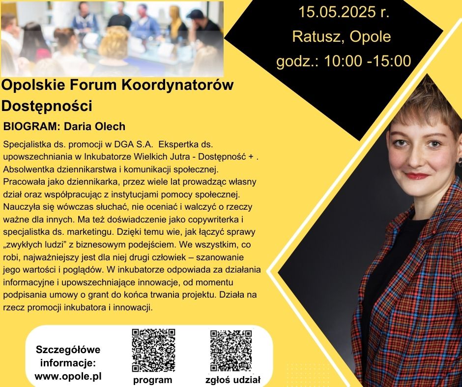 13:00 - 13:20 Daria Olech, secjalistka ds. promocji w DGA S.A. Ekspertka ds. upowszechniania w Inkubatorze Wielkich Jutra - Dostępność +