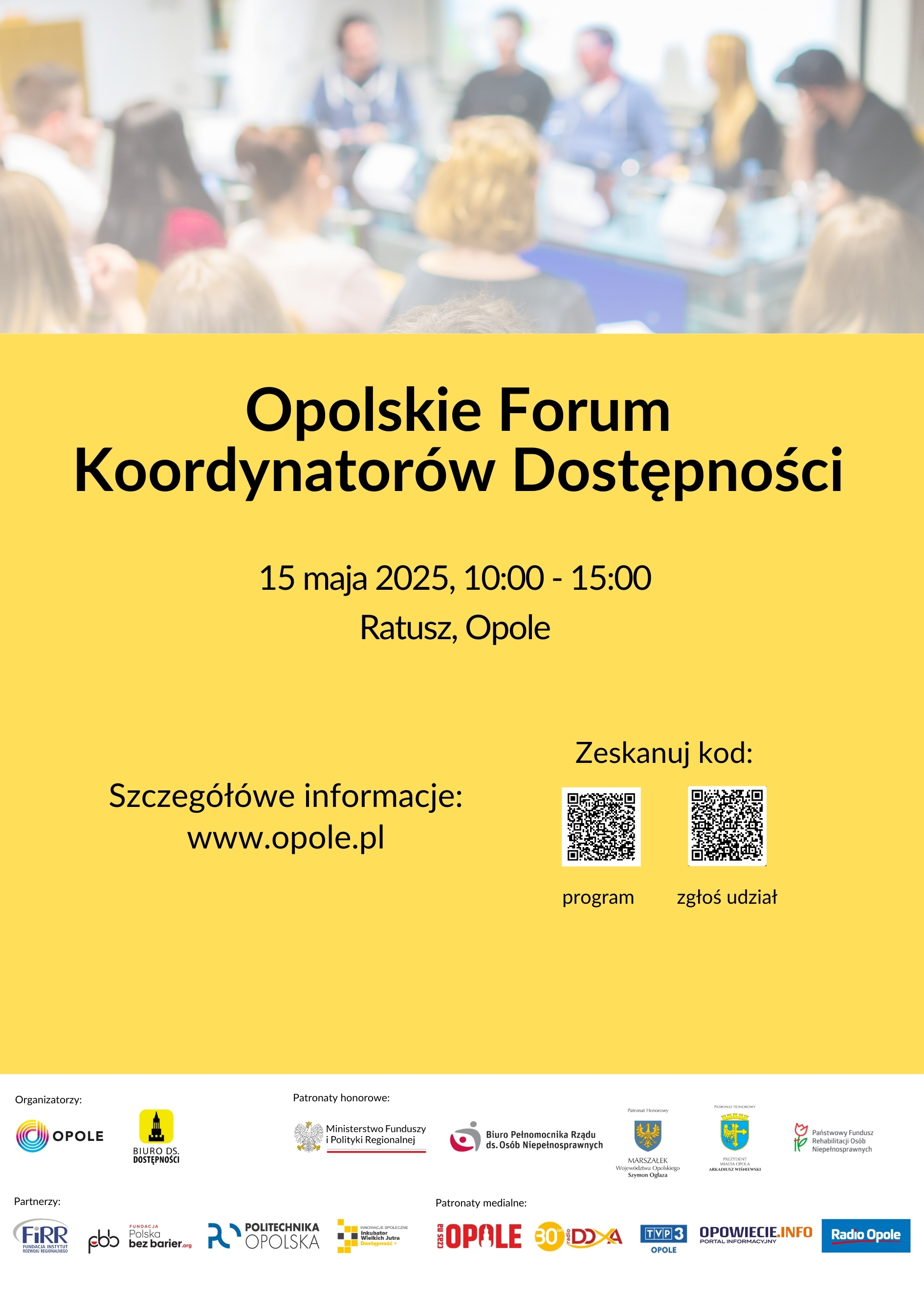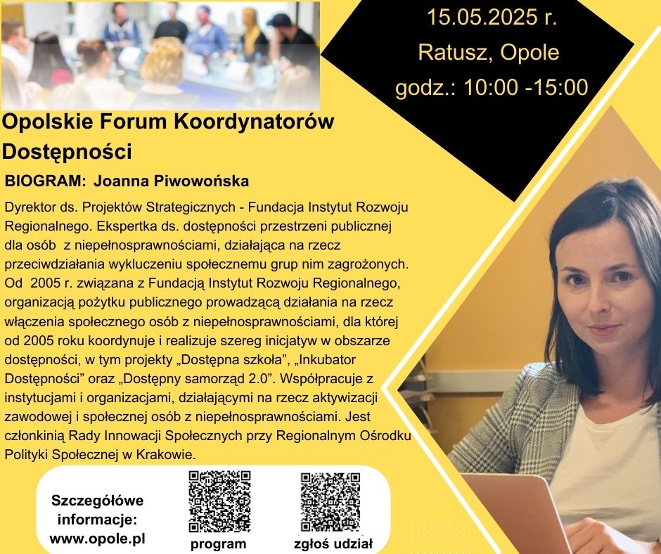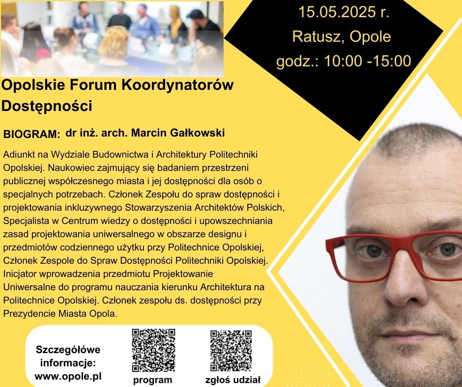 Prezydent Miasta Opola i Biuro ds. Dostępności Urzędu Miasta Opola zapraszają na Opolskie Forum Koordynatorów Dostępności, organizowane w ramach Światowego Dnia Świadomości Dostępności. Wydarzenie kierowane jest m.in. do koordynatorów dostępności urzędów gmin z województwa opolskiego oraz osób zawodowo związanych z zapewnieniem dostępności w jednostkach samorządu terytorialnego.