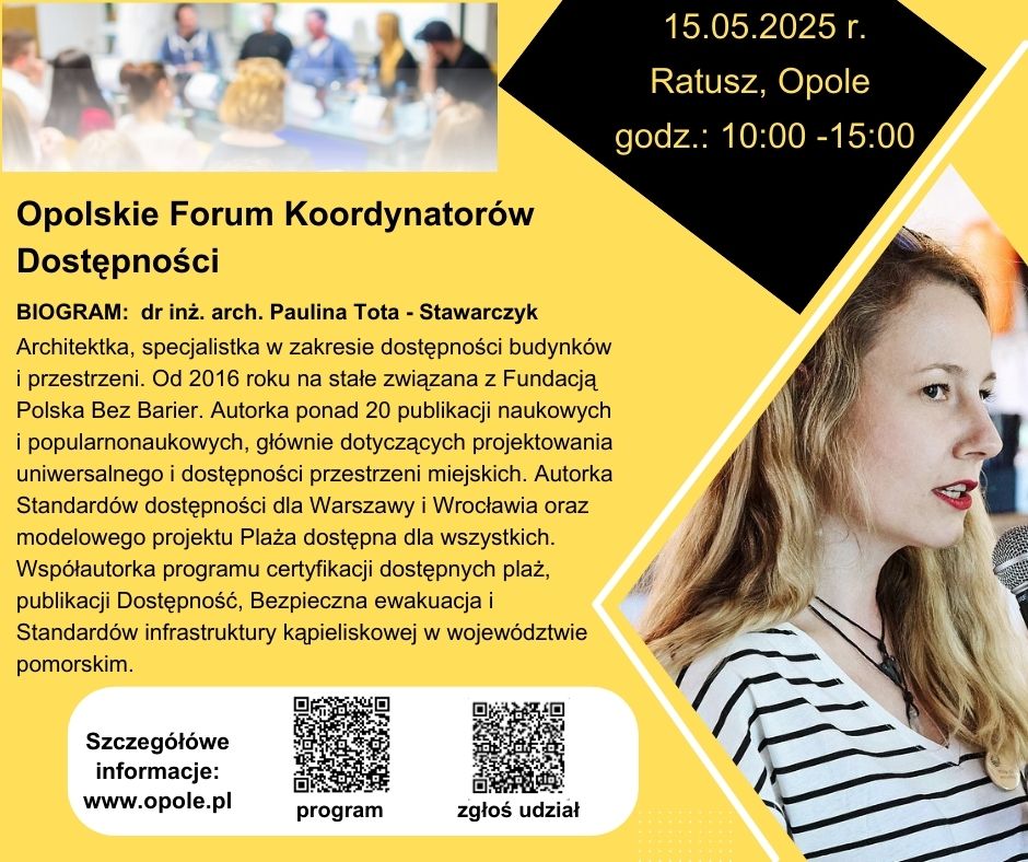 11:15 - 11:45 dr inż. arch. Paulina Tota-Stawarczyk, Fundacja Polska bez Barier