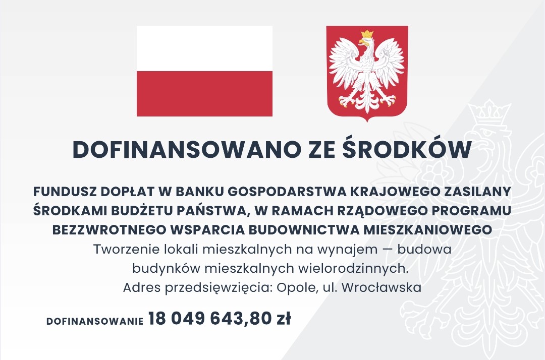 Miasto Opole informuje, że uzyskało finansowe wsparcie ze środków Funduszu Dopłat w ramach realizacji przez Bank Gospodarstwa Krajowego rządowego programu budownictwa mieszkaniowego.
